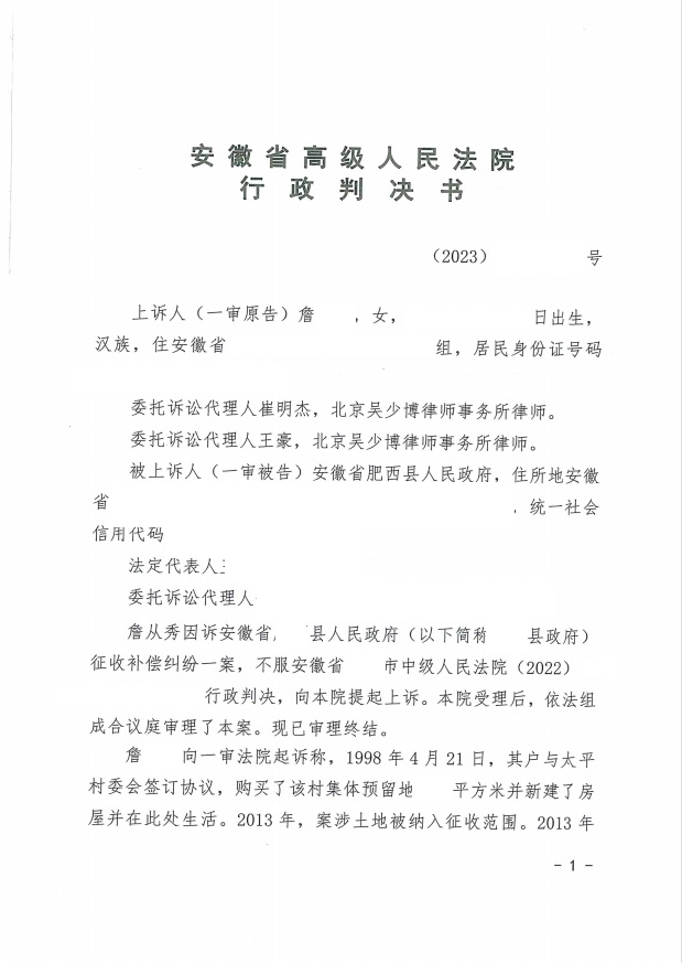 本案代理律師 北京吳少博律師事務(wù)所崔明杰 案情簡介: 1998年詹女士一家于安徽省某縣安家,